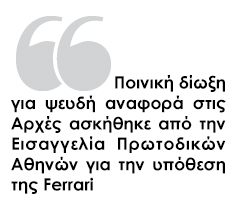 Ποινική δίωξη για ψευδή αναφορά στις Αρχές ασκήθηκε από την Εισαγγελία Πρωτοδικών Αθηνών για την υπόθεση της Ferrari του Μιχάλη Χατζηγιάννη.