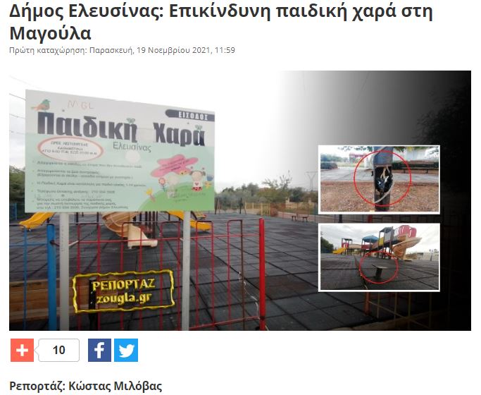 Η προϊσταμένη της Εισαγγελίας του Πρωτοδικείου Αθηνών κυρία Σωτηρία Παπαγεωργοπούλου διέταξε κατεπείγουσα εισαγγελική έρευνα με αφορμή την ανάδειξη του θέματος, με τίτλο «Επικίνδυνη παιδική χαρά στη Μαγούλα Ελευσίνας», προκειμένου να ελεγχθούν οι ποινικές ευθύνες του Δήμου Ελευσίνας για την κατάσταση των κοινόχρηστων χώρων. Την υπ’ αριθμ. ΑΒΜ/ΑΑ211531 ποινική δικογραφία ανέλαβε ο εισαγγελέας Πρωτοδικών κ. Κωνσταντίνος Σπυρόπουλος.