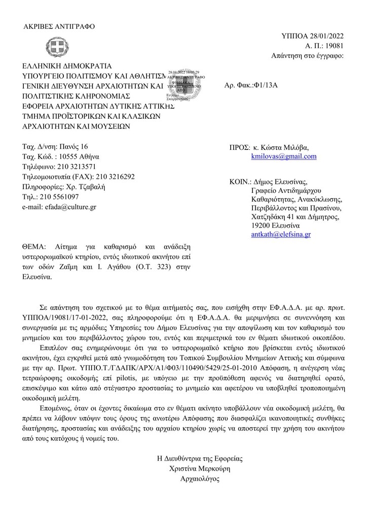 Στο ίδιο έγγραφο που υπογράφει η διευθύντρια της Εφορίας Αρχαιοτήτων Δυτικής Αττικής κα Χριστίνα Μερκούρη επισημαίνεται ότι «Επιπλέον σας ενημερώνουμε ότι για το υστερορωμαϊκό κτήριο που βρίσκεται εντός ιδιωτικού ακινήτου, έχει εγκριθεί μετά από γνωμοδότηση του Τοπικού Συμβουλίου Μνημείων Αττικής και σύμφωνα με την αρ. Πρωτ. ΥΠΠΟ.Τ./ΓΔΑΠΚ/ΑΡΧ/Α1/Φ03/110490/5429/25-01-2010 Απόφαση, η ανέγερση νέας τετραώροφης οικοδομής επί pilotis, με υπόγειο με την προϋπόθεση αφενός να διατηρηθεί ορατό, επισκέψιμο και κάτω από στέγαστρο προστασίας το μνημείο και αφετέρου να υποβληθεί τροποποιημένη οικοδομική μελέτη. Επομένως, όταν οι έχοντες δικαίωμα στο εν θέματι ακίνητο υποβάλλουν νέα οικοδομική μελέτη, θα πρέπει να λάβουν υπόψιν τους όρους της ανωτέρω Απόφασης που διασφαλίζει ικανοποιητικές συνθήκες διατήρησης, προστασίας και ανάδειξης του αρχαίου κτηρίου χωρίς να αποστερεί την χρήση του ακινήτου από τους κατόχους ή νομείς του».