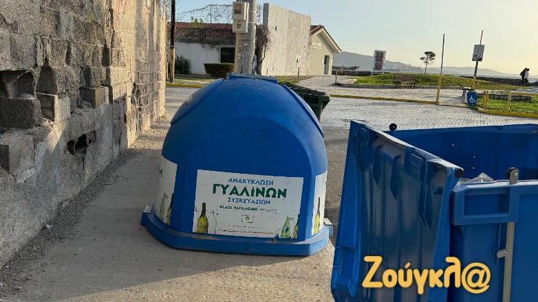 Ο συγκεκριμένος κάδος ανακύκλωσης για την συλλογή γυάλινων συσκευασιών είναι τοποθετημένος στο σημείο εδώ και περίπου δύο μήνες, χωρίς να έχει γίνει προσπάθεια απομάκρυνσής του.