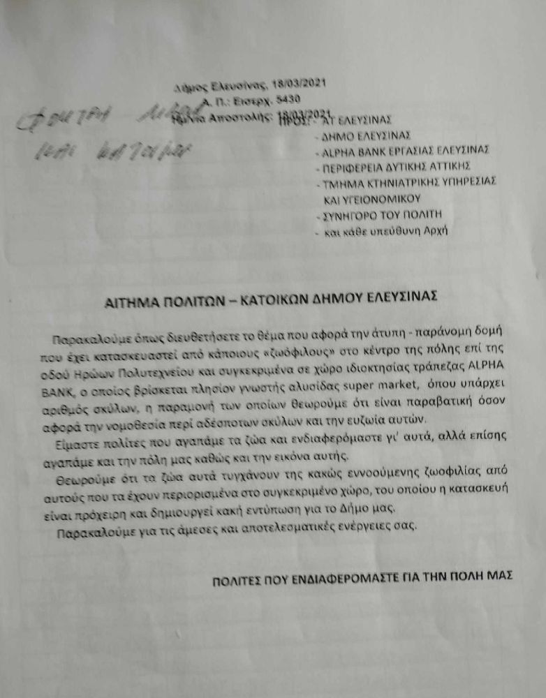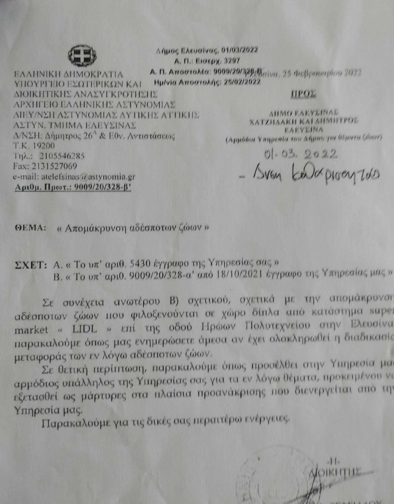 Σε ότι αφορά τον χώρο που πρόκειται να εγκατασταθούν οι 19 ψυχές ο δήμος της Ελευσίνας έχει κληθεί από 2021 να απομακρύνει τα ζώα από το σημείο σύμφωνα με εντολή του Υγειονομικού και σε συμμόρφωση με την κείμενη νομοθεσία.