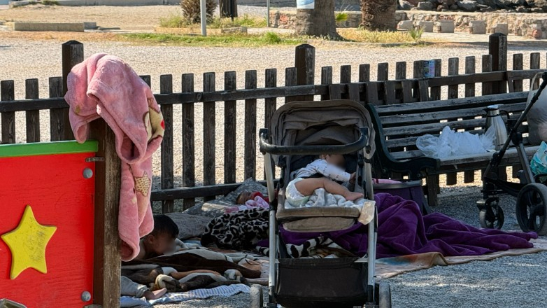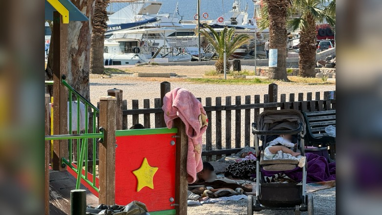 Εντός του χώρου της παιδικής χαράς έστησαν… νοικοκυριό. Έστρωσαν τα κλινοσκεπάσματα και όπως όλα δείχνουν πέρασαν εκεί τη νύχτα με μωρά παιδιά.