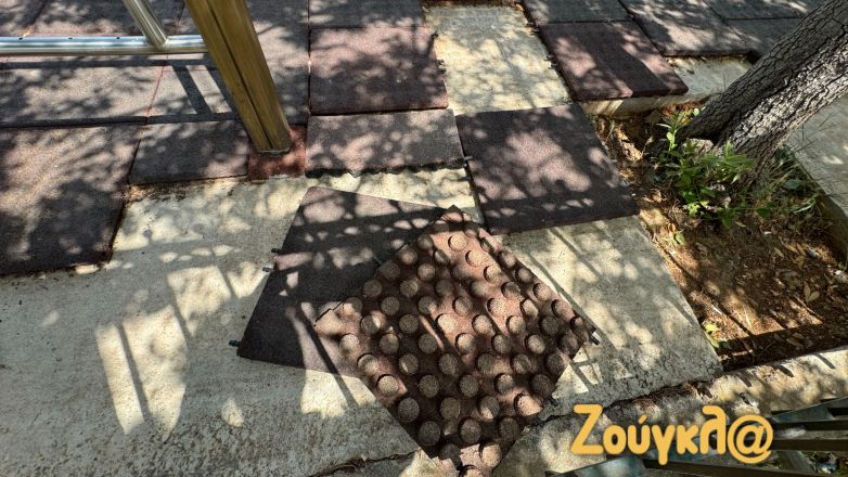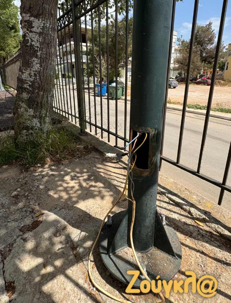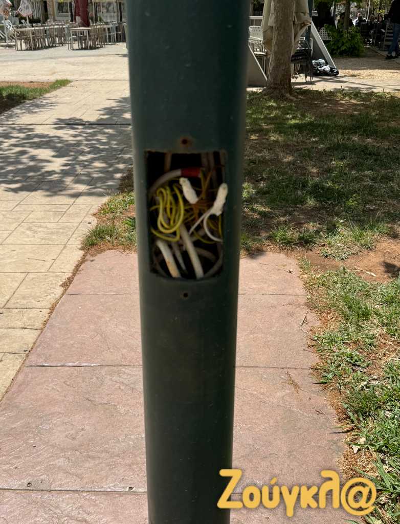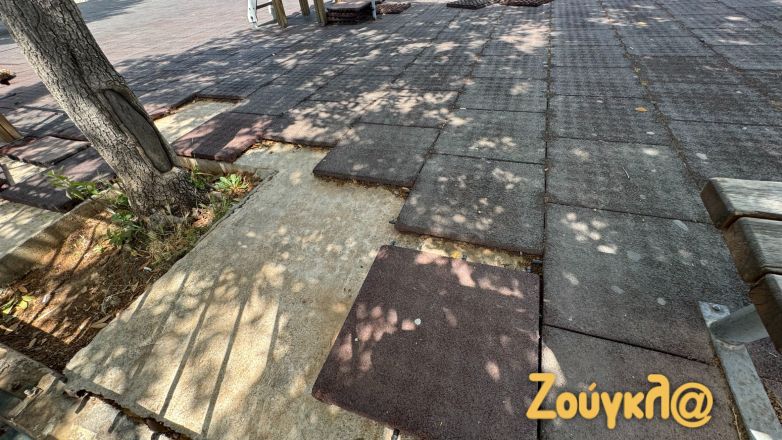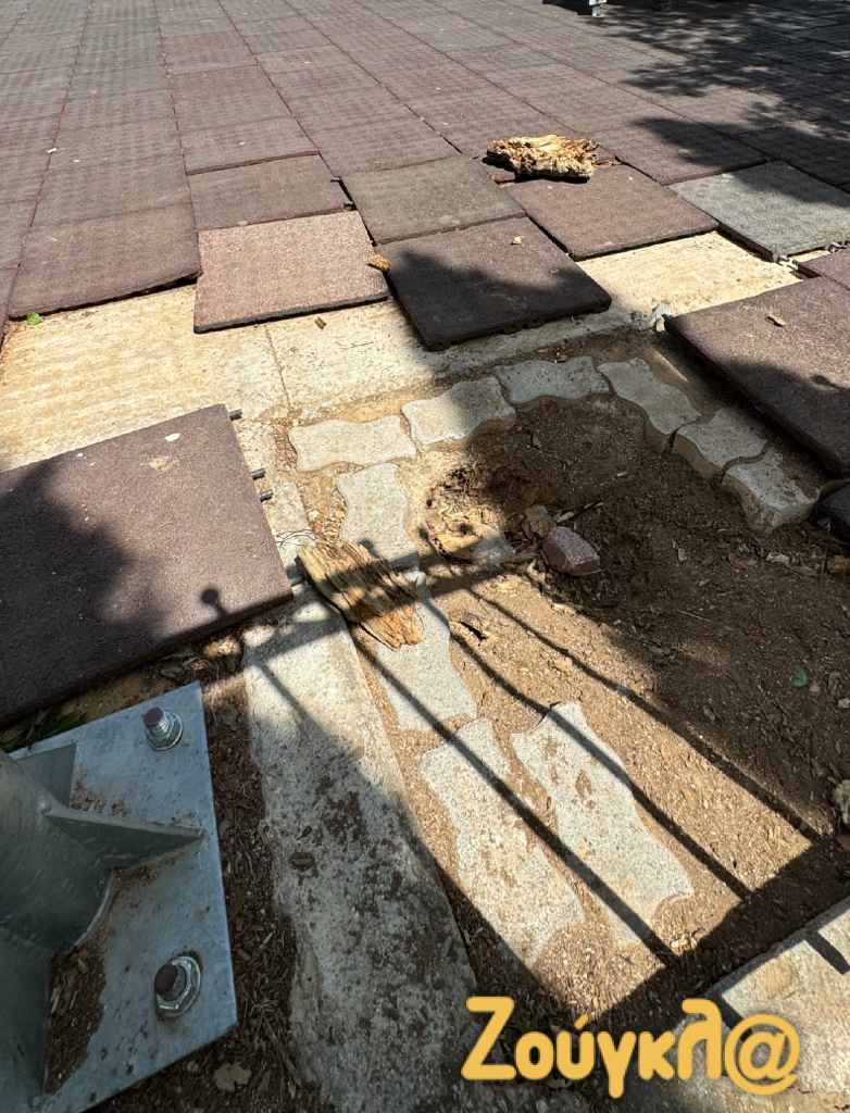 Οι εικόνες που ακολουθούν είναι αποκαλυπτικές τόσο από τους στύλους φωτισμούς με τα καλώδια του ηλεκτρικού ρεύματος να κρέμονται κυριολεκτικά από τα φωτιστικά, σε ένα χώρο μάλιστα που καθημερινά βρίσκονται για να παίξουν μικρά παιδάκια. Τα πλακάκια από ειδικό τάπητα έχουν αποκολληθεί από το δάπεδο πεταμένα μέσα στον χώρο ακόμα και πάνω σε δέντρα.