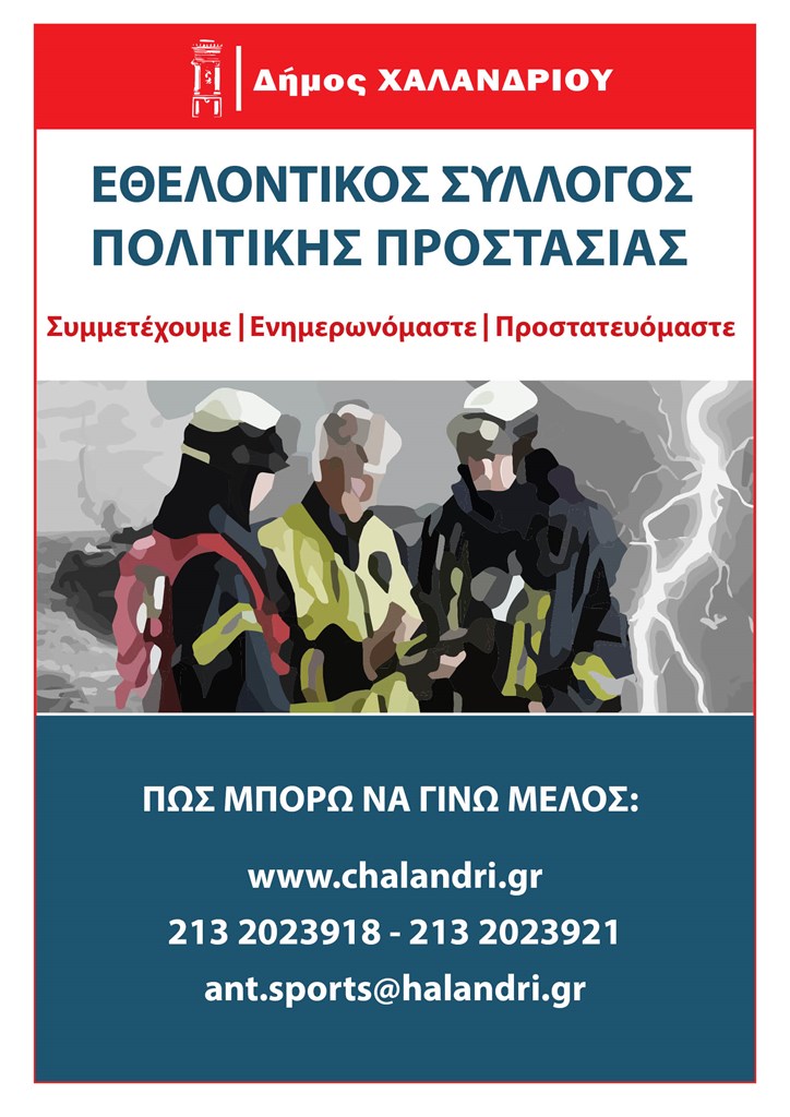 Ο Δήμος Χαλανδρίου στηρίζει τη δημιουργία Εθελοντικού Συλλόγου Πολιτικής Προστασίας, ο οποίος θα δραστηριοποιηθεί στην άμεση αντιμετώπιση των φυσικών και τεχνολογικών καταστροφών, στην ευαισθητοποίηση του κοινού και την δημιουργία οικολογικής συνείδησης στις νεότερες γενιές, στην αρωγή προς τους πληγέντες συνανθρώπους μας μετά από κάθε φυσική ή μη καταστροφή και στην προστασία της ζωής και των περιουσιών μας, σε περιπτώσεις πυρκαγιών, πλημμυρών, σεισμών, δυστυχημάτων, χιονοπτώσεων κοκ.