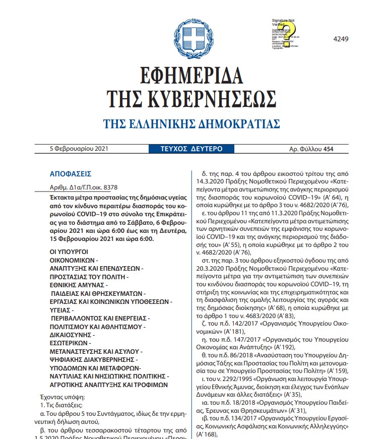 Δημοσιεύθηκαν στην εφημερίδα της Κυβερνήσεως τα έκτακτα μέτρα προστασίας της δημόσιας υγείας από τον κίνδυνο περαιτέρω διασποράς της νόσου COVID-19 ανά πεδίο δραστηριότητας στο σύνολο της Επικράτειας για το διάστημα από το Σάββατο, 6 Φεβρουαρίου 2021 και ώρα 6:00 έως και τη Δευτέρα, 15 Φεβρουαρίου 2021 και ώρα 6:00″.