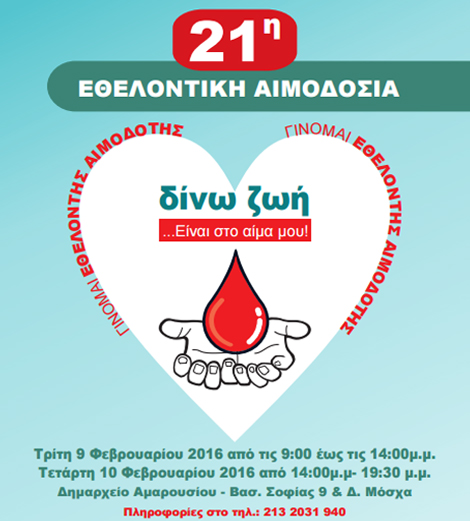 Η 21η εθελοντική αιμοδοσία θα πραγματοποιηθεί στο Δημαρχείο Αμαρουσίου (Βασ. Σοφίας 9 & Δ. Μόσχα) κατά τις ημέρες και ώρες: