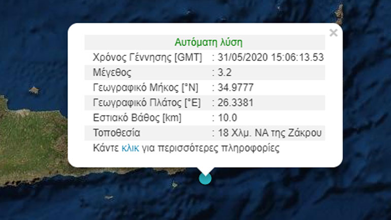 Η πρώτη δόνηση είχε εστιακό βάθος 8.6 χλμ και επίκεντρο στα 13 χλμ βορειοανατολικά της Σητείας, ενώ η Δεύτερη καταγράφηκε σε βάθος 10 χλμ και το επίκεντρό της εντοπίζεται στα 18 χλμ νοτιοανατολικά της Ζάκρου.