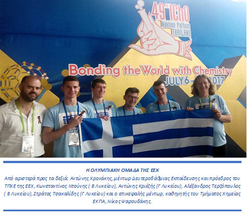 Η ΔΕ της Ένωσης Ελλήνων Χημικών (ΕΕΧ) ανακοινώνει με ιδιαίτερη χαρά και συγκίνηση την μεγάλη επιτυχία της Ολυμπιακής της ομάδας, η οποία κατέκτησε δύο χάλκινα μετάλλια στην 49η ΔΙΕΘΝΗ ΟΛΥΜΠΙΑΔΑ ΧΗΜΕΙΑΣ (https://icho2017.sc.mahidol.ac.th/).