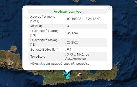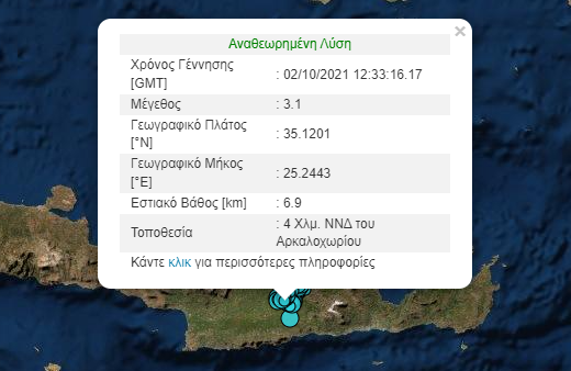 Ενώ ο δεύτερος μετασεισμός σημειώθηκε στις 16:33, 4 χιλιόμετρα νότια-νοτιοδυτικά του Αρκαλοχωρίου και το εστιακό βάθος του ήταν 6.9 χιλιόμετρα.
