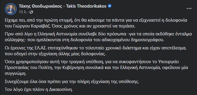 Με ανάρτηση στα μέσα κοινωνικής δικτύωσης ο υπουργός Προστασίας του Πολίτη, κ. Τάκης Θεοδωρικάκος γνωστοποίησε πως η ΕΛ.ΑΣ προχώρησε σε δύο συλλήψεις για την υπόθεση της δολοφονίας του δημοσιογράφου, Γιώργου Καραϊβάζ.