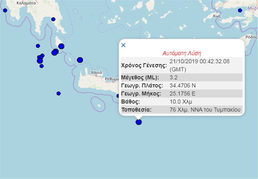 Σεισμός μεγέθους 3,2 βαθμών της κλίμακας Ρίχτερ σημειώθηκε στις 03.42 τα ξημερώματα στην Κρήτη, στη θαλάσσια περιοχή ανοιχτά του Τυμπακίου.