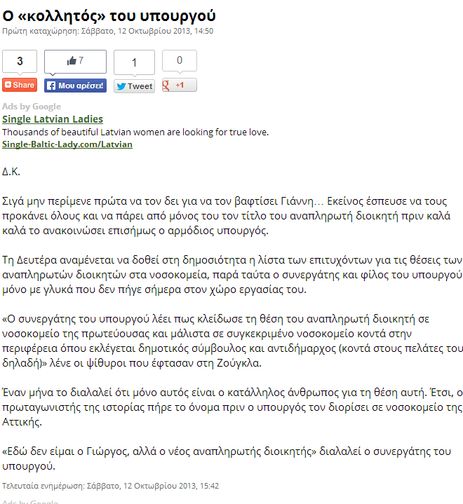 12 Οκτωβρίου 2013. Tο zougla.gr δημοσίευσε στη στήλη «Παραπολιτική» άρθρο σχετικά με στενό σύμβουλο-φίλο του υπουργού Υγείας κ. Άδωνι Γεωργιάδη, ο οποίος τον τελευταίο καιρό -και πριν ανακοινωθούν οι νέοι διοικητές των νοσοκομείων- διαλαλούσε σε γνωστούς και φίλους ότι έχει ήδη «καπαρώσει» τη θέση.