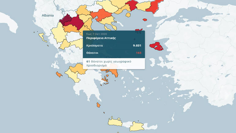 Στον διαδραστικό χάρτη βρίσκουμε ανά περιφέρεια το σύνολο των κρουσμάτων, τους συνολικούς θανάτους και τον αριθμό των ασθενών που έχουν αναρρώσει.