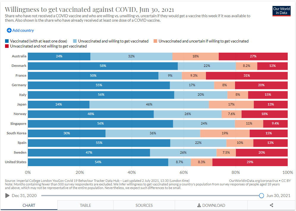 Όσον αφορά στις χώρες των οποίων οι πολίτες δεν έχουν εμβολιαστεί και δεν είναι και σίγουροι για το εάν τελικά θα εμβολιαστούν, πρώτη είναι η Αυστραλία και ακολουθούν η Νότια Κορέα και η Ιαπωνία.