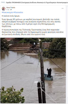 Την ίδια ώρα, η εικόνα ενός άνδρα ηλικίας 80 ετών από τη Μεταμόρφωση Καρδίτσας έχει συγκινήσει το ελληνικό ίντερνετ, εν μέσω του ισχυρού «κύματος» της κακοκαιρίας Daniel. Ο ηλικιωμένος φαίνεται να διασχίζει δρόμους – ποτάμια με μία βάρκα, αναζητώντας συμπολίτες του, στις ταράτσες των σπιτιών της περιοχής.