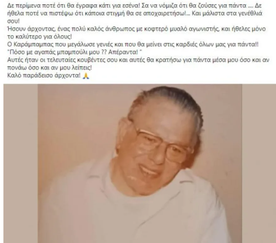 «Δεν περίμενα ποτέ ότι θα έγραφα κάτι για σένα. Σαν να νόμιζα ότι θα ζούσες για πάντα. Δεν ήθελα ποτέ να πιστέψω ότι κάποια στιγμή θα σε αποχαιρετήσω» γράφει μεταξύ άλλων η κόρη του, η οποία έκανε γνωστή την είδηση του θανάτου του μέσα από το Facebook.