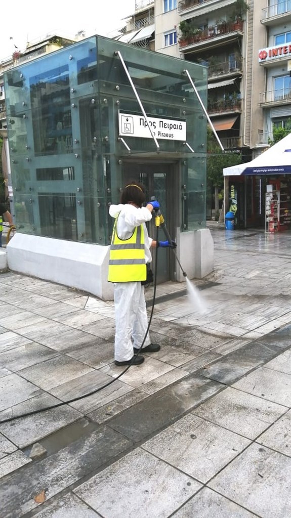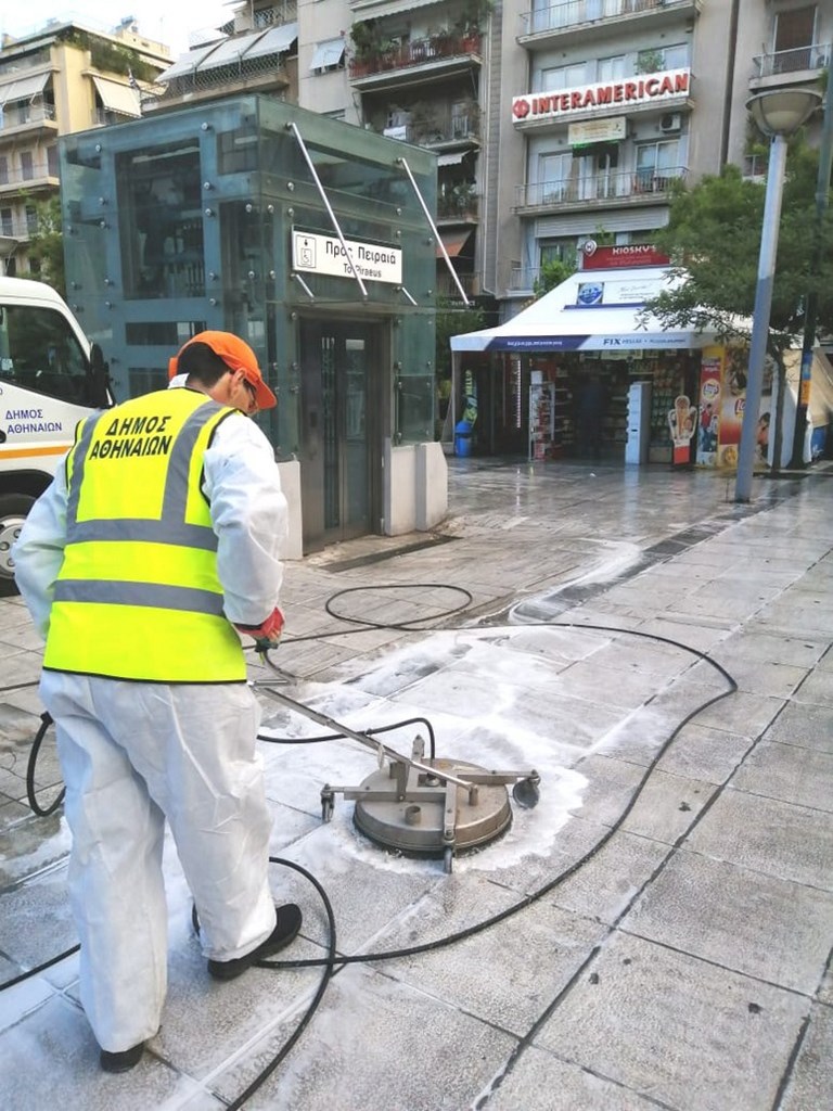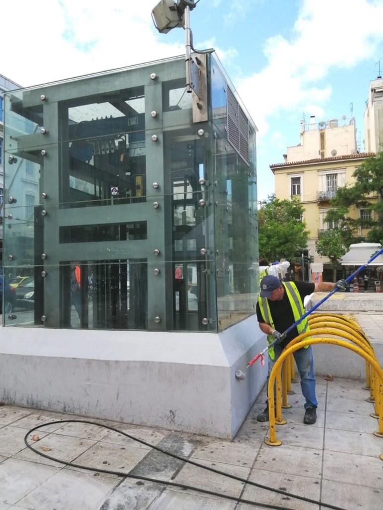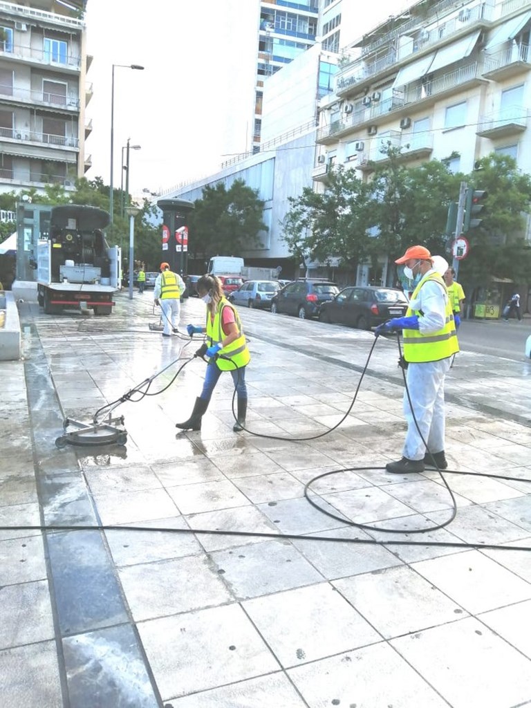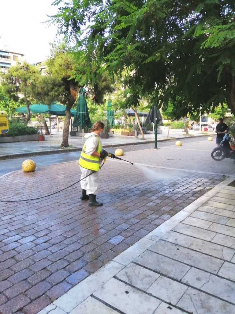 Οι άνθρωποι της Διεύθυνσης Καθαριότητας από νωρίς το πρωί σκούπισαν σχολαστικά την πλατεία ενώ στη συνέχεια τόσο ο χώρος της πλατείας όσο και τα γύρω πεζοδρόμια «σφουγγαρίστηκαν» με τα νέα ειδικά μηχανήματα που απελευθερώνουν με μεγάλη πίεση ζεστό νερό- ατμό (έως 98 βαθμούς Κελσίου) καθαρίζοντας και απολυμαίνοντας ταυτόχρονα.