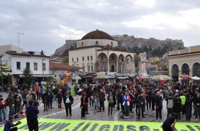 Άνθρωποι κάθε ηλικίας σχημάτισαν στην πλατεία Μοναστηρακίου τα γράμματα της φράσης «Φυτεύουμε τη λύση».