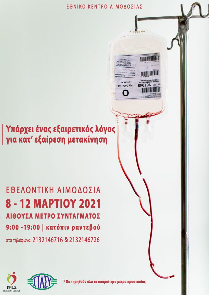 Το Ε.ΚΕ.Α., με πλήρη συναίσθηση της ευθύνης του για την επάρκεια των αποθεμάτων αίματος στη χώρα μας, καλεί κάθε νέο ή παλιό αιμοδότη, να προσέλθει στην Αίθουσα Πολλαπλών Χρήσεων του Μετρό Συντάγματος, στέλνοντας το μήνυμα 1 στο 13033 ή συμπληρώνοντας Β1 στη «Βεβαίωση κατ’ εξαίρεση μετακίνησης πολιτών» της Γενικής Γραμματείας Πολιτικής Προστασίας.