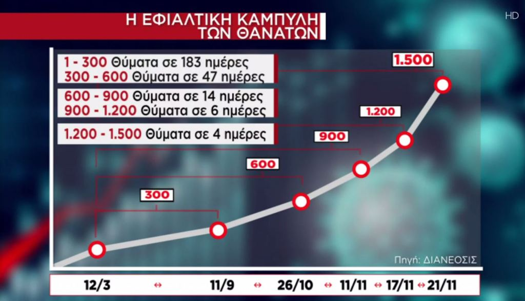 Οι περισσότεροι θάνατοι λόγω κορωνοϊού στη χώρα μας καταγράφηκαν τον μήνα Νοέμβριο, αφού μόνο τις δύο τελευταίες ημέρες κατέληξαν 211 ασθενείς. Αυτό δείχνει και την πίεση που δέχεται το ΕΣΥ, παρά το lockdown και την επιβολή αυστηρών μέτρων ως προς τη μετακίνηση των πολιτών. Η κατάσταση παραμένει ανησυχητική, καθώς χθες μόνο έχασαν τη ζωή τους 103 συνάνθρωποί μας, οι διασωληνωμένοι έφτασαν τους 504, ενώ ο μειωμένος αριθμός των κρουσμάτων που ανακοινώθηκε (1.498) οφείλεται στο ότι έγιναν λιγότερα τεστ από τις προηγούμενες ημέρες.