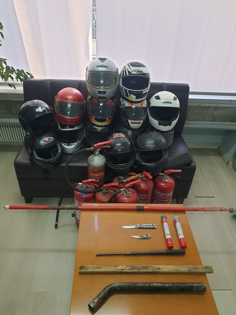 Ειδικότερα, σε μία περίπτωση συνελήφθη ο νόμιμος εκπρόσωπος, ενώ κατά την έρευνα βρέθηκαν και κατασχέθηκαν, εμπρηστική μολότοφ, μπουκάλι βενζίνης 500 ml, 2 τελάρα με άδεια μπουκάλια μπύρας και αναψυκτικών, 7 ναυτικές φωτοβολίδες, φωτοβολίδα και βεγγαλικό, σιδερολοστοί, 2 σκεπάρνια, 2κατσαβίδια, σφυρί και σφυρί θραύσης υαλοπινάκων, αλυσίδα μήκους 8,65 μέτρων και 2 κράνη.