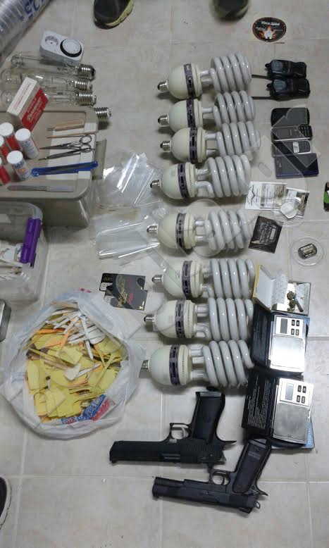 Από την έρευνα στις οικίες τους βρέθηκε ένα πλήρως εξοπλισμένο και οργανωμένο εργαστήριο υδροπονικής καλλιέργειας δενδρυλλίων κάνναβης, πλήθος λειτουργικών εξαρτημάτων που προορίζοταν για την κατασκευή εργαστήριου υδροπονικής καλλιέργειας κάνναβης, πλήθος συσκευασιών περιέχουσες σπόρους κάνναβης, τρεις ζυγαριές ακριβείας, ένας ηλεκτρικός τρίφτης, μεγάλος αριθμός πλαστικών κυτίων που προορίζοταν για την αποθήκευση ναρκωτικών ουσιών, δύο πιστόλια τύπου REPLICA και ένα αεροβόλο τυφέκιο.