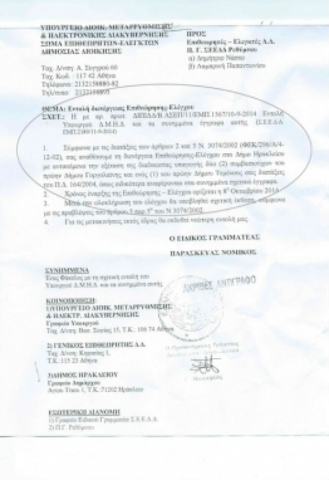 Μάλιστα, όπως αποκαλύπτει το έγγραφο, διατάσσονται οι Επιθεωρητές Δημήτρης Νάστος και Λαμπρινή Παπαντωνίου να αρχίσουν την ελεγκτική διαδικασία. Το θέμα βεβαίως είναι αν η διαδικασία θα αφορά μόνον αυτούς τους 3 υπαλλήλους των συγκεκριμένων δημοτικών ενοτήτων ή θα συμπαρασύρει και άλλες περιπτώσεις του Προεδρικού Διατάγματος Παυλόπουλου και βεβαίως πώς θα αντιδράσουν δήμος Ηρακλείου και εργαζόμενοι σ΄αυτόν στην απρόσμενη αυτή εξέλιξη!