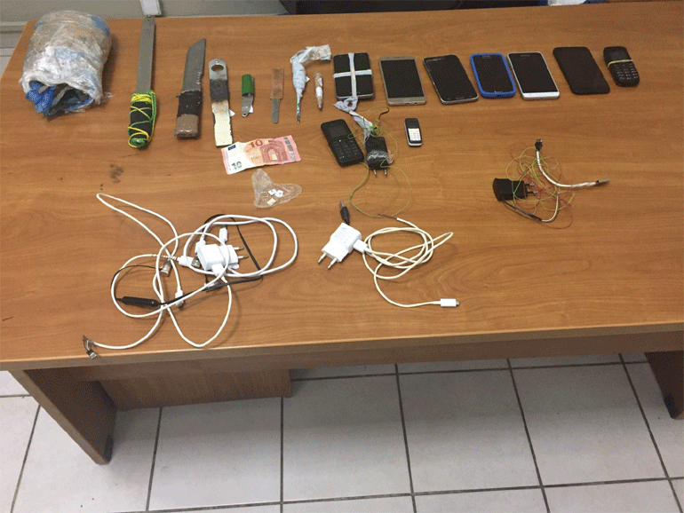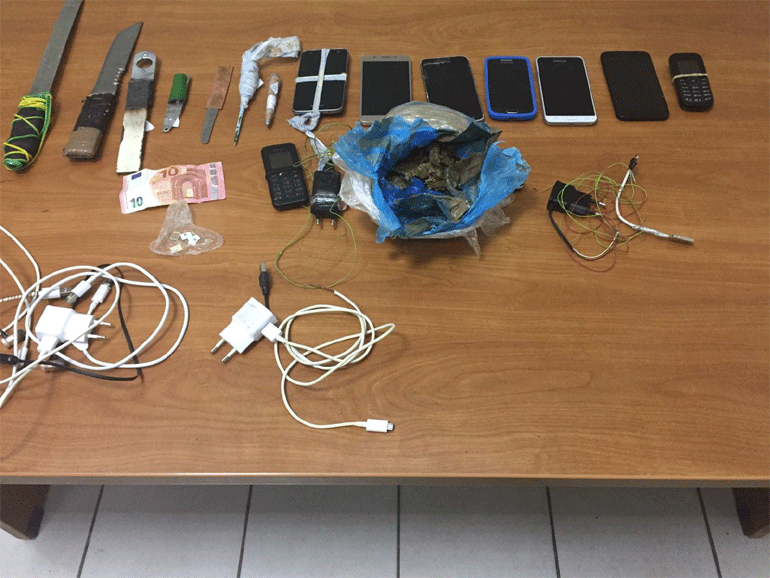 Ειδικότερα, κατασχέθηκαν: δέκα κινητά τηλέφωνα και πέντε κάρτες SIM, 9 φορτιστές και 3 ζευγάρια ακουστικών, 8 αυτοσχέδια μαχαίρια, 2 σουβλιά και συσκευασία με ακατέργαστη κάνναβη μικτού βάρους 186 γραμμαρίων.