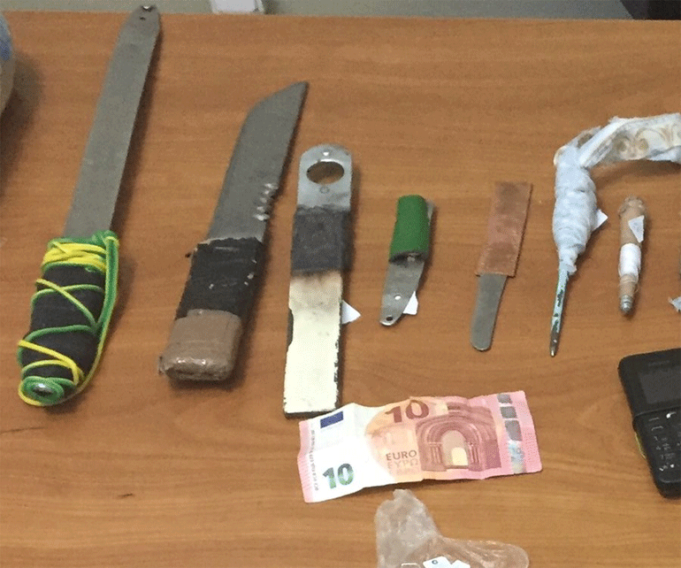 Από τις έρευνες βρέθηκαν και κατασχέθηκαν αυτοσχέδια μαχαίρια, σουβλιά, ναρκωτικά, κινητά, φορτιστές και ακουστικά.