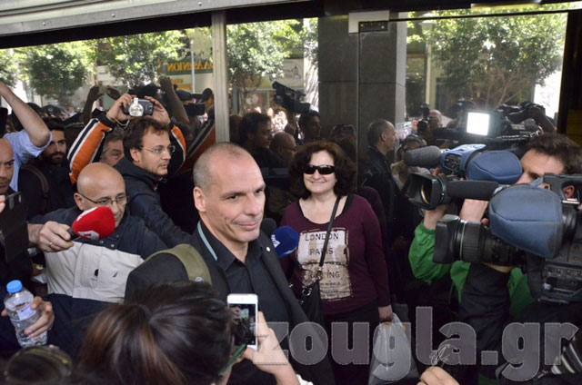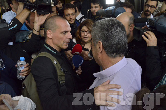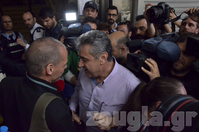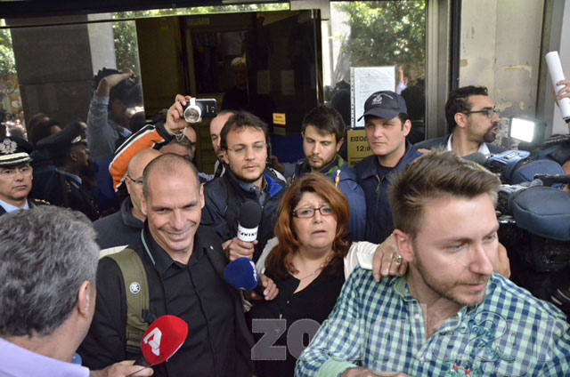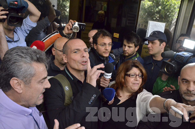 Στο σημείο έφθασε λίγο μετά τις 13.00 το μεσημέρι ο Γιάνης Βαρουφάκης, ο οποίος είχε σύντομη συνομιλία με τους διαδηλωτές. Ο υπουργός Οικονομικών εξήγησε πως η «ασφυξία» που προκαλείται από τη στάση των θεσμών δεν βοηθάει προς το παρόν στην επίλυση του ζητήματος της μισθοδοσίας.