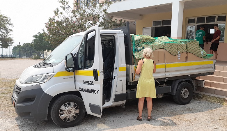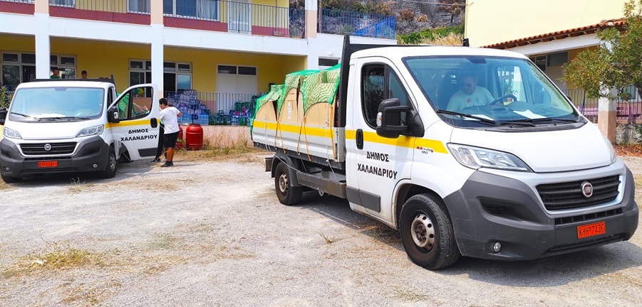 Δύο φορτηγά του Δήμου Χαλανδρίου μετέφεραν και παρέδωσαν στις Ροβιές, την Τρίτη 10 Αυγούστου 2021 τρόφιμα μακράς διαρκείας, βρεφικά είδη και είδη προσωπικής υγιεινής.