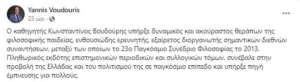 Έφυγε από τη ζωή στις 23 Αυγούστου ο Έλληνας καθηγητής φιλοσοφίας, με επίκεντρο επιστημονικών ενδιαφερόντων την ελληνική, την αναλυτική και την πολιτική φιλοσοφία, Κωνσταντίνος Βουδούρης.
