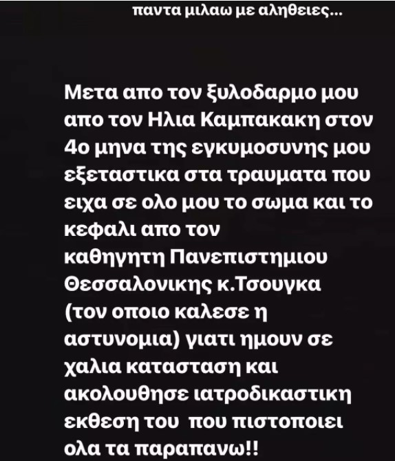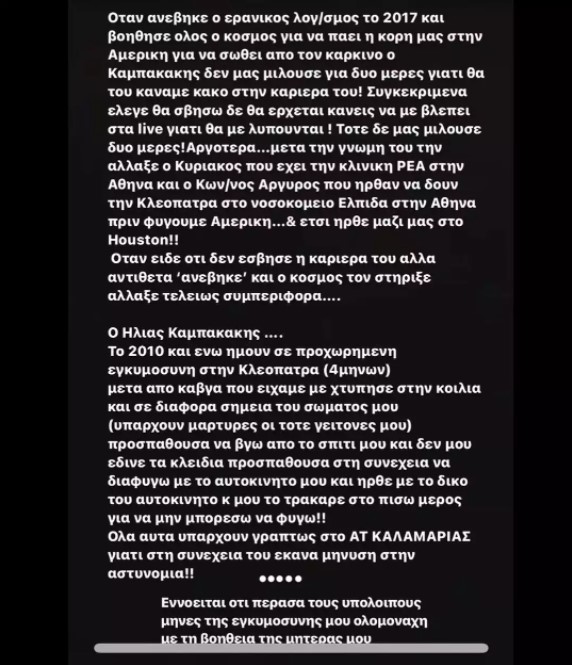 «Ο Ηλίας Καμπακάκης… Το 2010, και ενώ ήμουν σε προχωρημένη εγκυμοσύνη στην Κλεοπάτρα (4 μηνών), μετά από καβγά που είχαμε με χτύπησε στην κοιλιά και σε διάφορα σημεία του σώματός μου», αναφέρει μεταξύ άλλων στις αναρτήσεις της στο Ιnstagram.