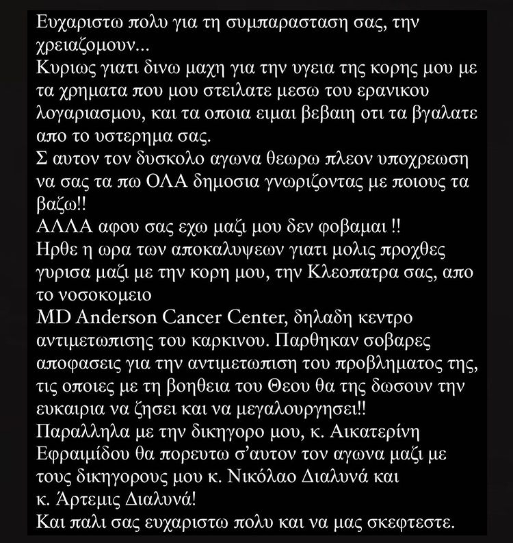 Στην παρακάτω ανάρτηση, η οποία έγινε το βράδυ της Δευτέρας, ανακοινώνει μεταξύ άλλων τους δικηγόρους της, τον Νίκο και την Άρτεμη Διαλυνά, και ευχαριστεί τους πολίτες για τη στήριξή τους.