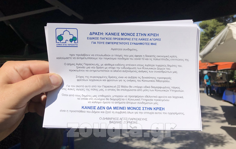 Μια πρωτότυπη πρωτοβουλία έχει αναλάβει ο Δήμος Αγίας Παρασκευής, προκειμένου να ενισχυθούν οι πολίτες που πλήττονται ιδιαίτερα. Από την Παρασκευή 22 Μαΐου υπάρχει ειδικά διαμορφωμένος πάγκος στις λαϊκές αγορές της πόλης που στελεχώνεται από μέλη των Κοινωνικών Υπηρεσιών, ο οποίος δέχεται τις προσφορές πολιτών σε φρέσκα φρούτα και λαχανικά για την ενίσχυση των κοινωνικών δομών του Δήμου.