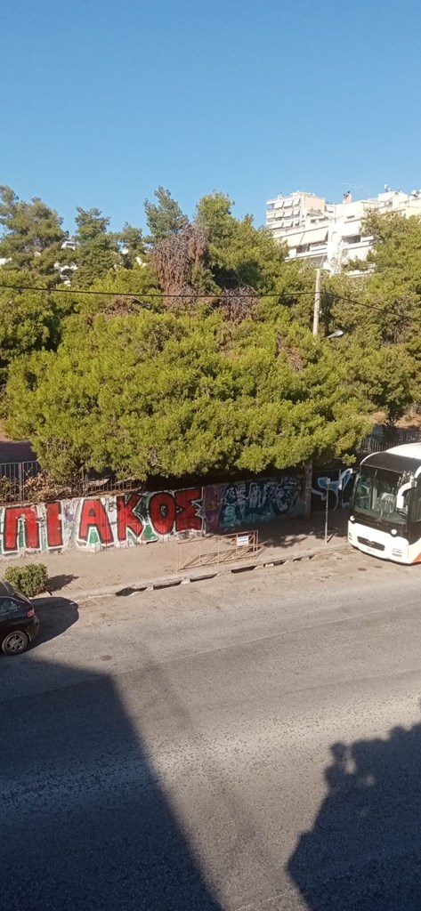 Οι παρακάτω εικόνες με τα ακλάδευτα πεύκα, τα κλαδιά των οποίων φθάνουν μέχρι τον δρόμο, βρίσκονται σε κατοικημένη περιοχή στον περίβολο του Γυμνασίου Δάφνης -Υμηττού επί της λεωφόρου Ηλιουπόλεως απέναντι από την οδό Κύπρου.