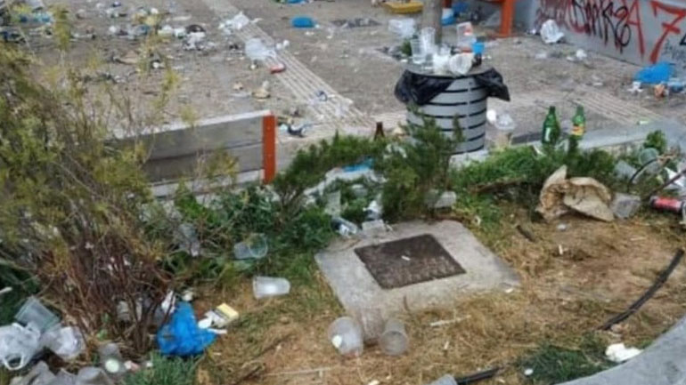 Η περιοχή θυμίζει «βομβαρδισμένο τοπίο» από τα σκουπίδια που άφησαν στο έδαφος οι περισσότεροι, αν όχι όλοι, από όσους βρέθηκαν στο σημείο για να διασκεδάσουν και να συναντήσουν τους φίλους τους. Είναι απολύτως σεβαστό και κατανοητό να καταφεύγει ο κόσμος στο πάρκο και την πλατεία της γειτονιάς του για να ξεσκάσει. Ωστόσο προκαλεί εντύπωση το γεγονός ότι κανένας από τους παρευρισκόμενους δεν σκέφτηκε να αφήσει τα άδεια μπουκάλια στον πλησιέστερο κάδο απορριμμάτων, πριν επιστρέψουν στο σπίτι τους.
