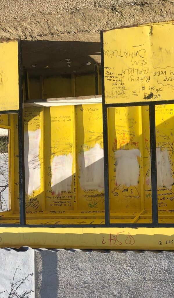Τα συνθήματα πέριξ της εκκλησίας σβήστηκαν με μπογιά, ενώ το ίδιο όπως φαίνεται και στην φωτογραφία, έκαναν και στην στάση των λεωφορείων του ΚΤΕΛ. Στο κατάστημα που είναι κλειστό επί χρόνια, θα πρέπει φυσικά να γίνει αλλαγή των τζαμιών και γι’ αυτό παρέμειναν.