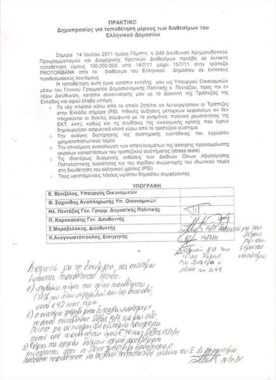 Ιούλιος 2011. Δύο μήνες προτού οι εισαγγελικές Αρχές ξεκινήσουν να «σκαλίζουν» την υπόθεση Λαυρεντιάδη και ενώ οι «φήμες» για ένα σκάνδαλο το οποίο βρισκόταν προ των πυλών πύκνωναν, ο κ. Βενιζέλος διαβίβασε, μέσω του τότε γενικού γραμματέα Δημοσιονομικής Πολιτικής κ. Ηλία Πεντάζου, στη Δ49 Διεύθυνση Χρηματοδοτικού Προγραμματισμού, την εντολή να πιστώσει στην τράπεζα Proton Bank 100.000.000 ευρώ από τα διαθέσιμα του ελληνικού Δημοσίου.