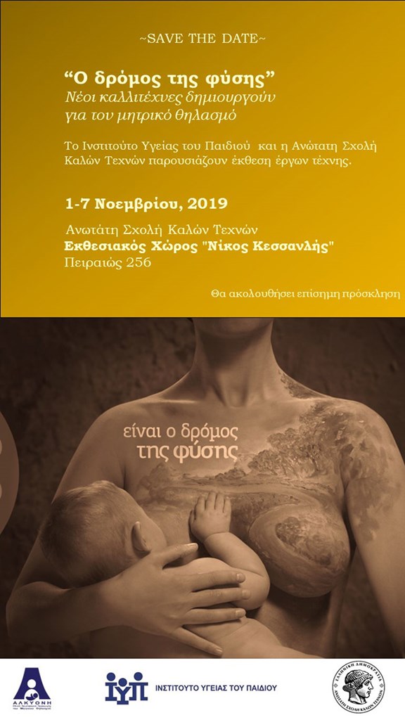 Έκθεση νέων καλλιτεχνών με θέμα «”Ο δρόμος της φύσης”, Νέοι καλλιτέχνες δημιουργούν για τον μητρικό θηλασμό», η οποία θα διεξαχθεί στον εκθεσιακό χώρο της Σχολής «Νίκος Κεσσανλής», πραγματοποιείται από τις 1-7 Νοεμβρίου, με αφορμή τον εορτασμό της Εβδομάδας Μητρικού Θηλασμού. Η έκθεση διοργανώνεται από το Ινστιτούτο Υγείας Παιδιού, τη Διεύθυνση Κοινωνικής και Αναπτυξιακής Παιδιατρικής, και την Ανώτατη Σχολή Καλών Τεχνών.