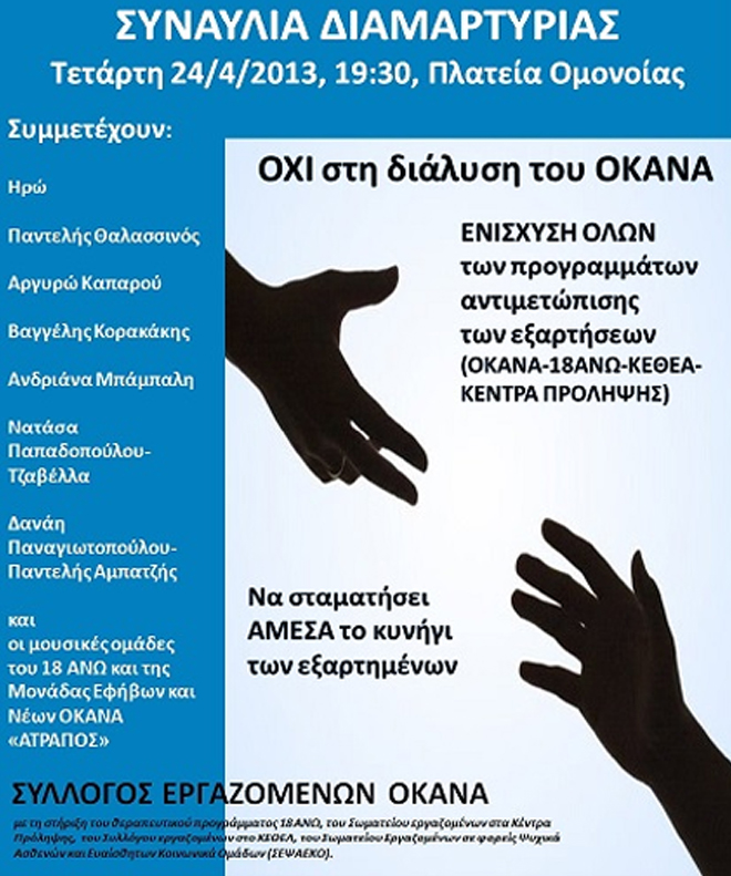 Εδώ και ένα μήνα οι εργαζόμενοι στον ΟΚΑΝΑ έχουμε προχωρήσει σε κατάληψη των Κεντρικών Υπηρεσιών του Οργανισμού, γιατί είναι ο μόνος τρόπος που έχουμε για να αντιδράσουμε σε όλες εκείνες τις πολιτικές επιλογές, που υπονομεύουν την προοπτική του, απαξιώνουν το περιεχόμενο της δουλειάς μας και θέτουν σε κίνδυνο τη ζωή και το μέλλον των 8.500 θεραπευομένων στα Προγράμματα Υποκατάστασης καθιστώντας ταυτόχρονα αδύνατη την απορρόφηση της λίστας αναμονής 3.500 συνανθρώπων μας.