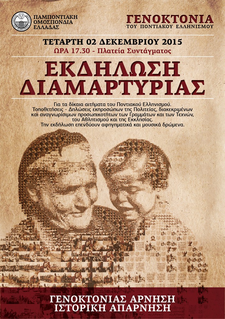 Εκδήλωση διαμαρτυρίας πραγματοποιεί, στις 17:30 το απόγευμα της Τετάρτης, στην πλατεία Συντάγματος, ο Σύνδεσμος Ποντιακών Σωματείων Νοτίου Ελλάδος και Νήσων της Παμποντιακής Ομοσπονδίας Ελλάδος.