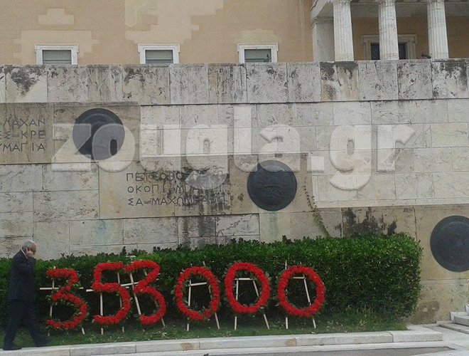 Οι συγκεντρωμένοι κατέθεσαν στο μνημείο του Αγνώστου Στρατιώτη στεφάνια που σχημάτιζαν το νούμερο «353.000» αριθμός που αντιστοιχεί στον αριθμό των θυμάτων.