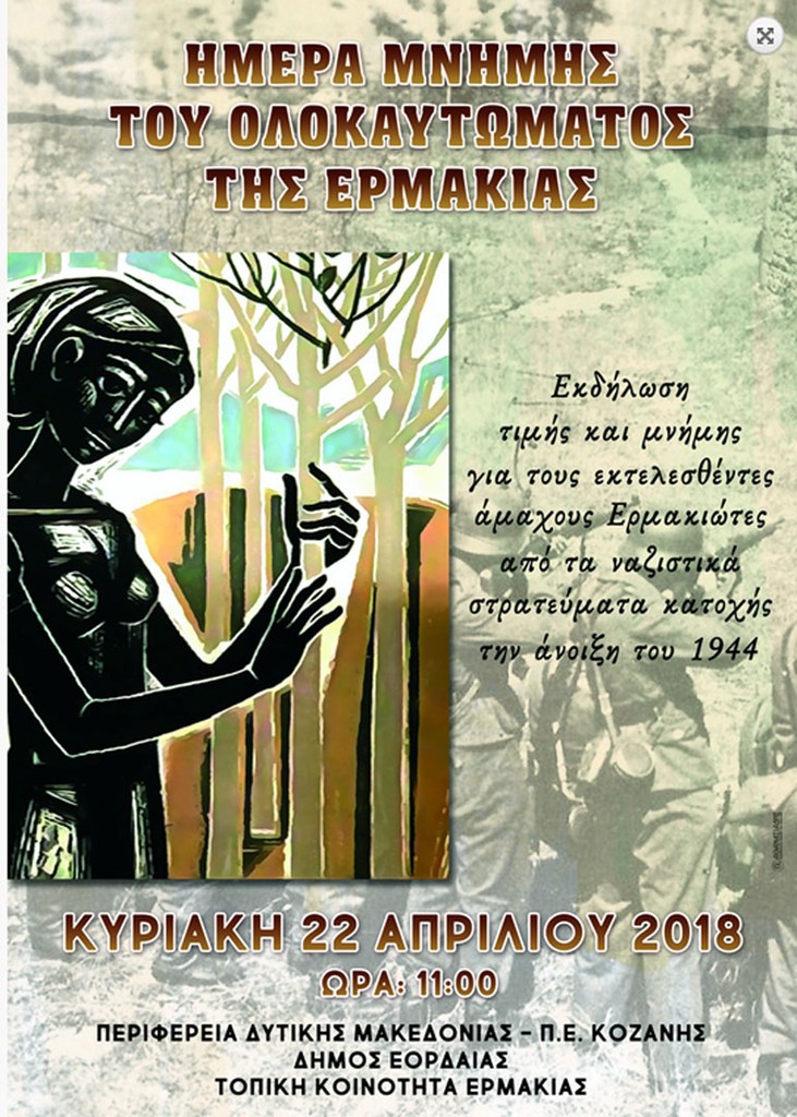 Η Περιφερειακή Ενότητα Κοζάνης, ο Δήμος Εορδαίας και η Τοπική Κοινότητα Ερμακιάς σας προσκαλούν την Κυριακή, 22 Απριλίου 2018 και ώρα 11:00 πμ. στην Μαρτυρική Ερμακιά, να τιμήσετε με την παρουσία σας την εκδήλωση Τιμής και Μνήμης των θυμάτων της ναζιστικής θηριωδίας την Άνοιξη του 1944.