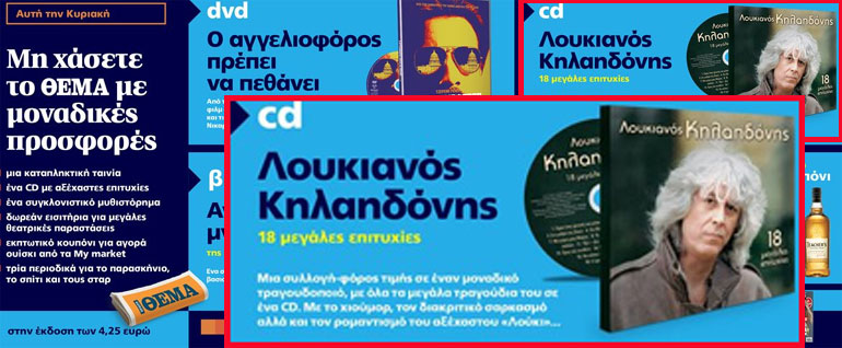 Όπως πληροφορηθήκαμε, η εφημερίδα σας πρόκειται αύριο να κυκλοφορήσει με συνοδευτική «προσφορά» για τους αναγνώστες της, ένα cd με 18 αξέχαστα τραγούδια του Λουκιανού.