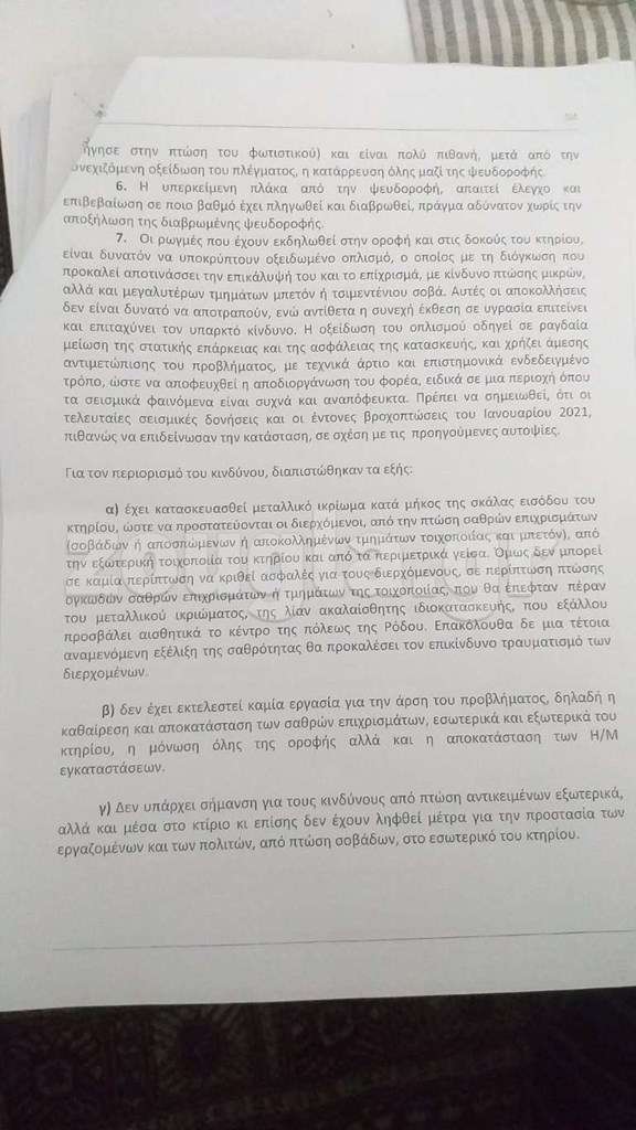 Σοβαρό πρόβλημα δημόσιας ασφάλειας υφίσταται στο κτήριο του Κτηματολογίου της Ρόδου, όπως αποδεικνύεται από σχετικές αυτοψίες των δημόσιων αρχών, ενώ προηγήθηκαν οι αγωνιώδεις εκκλήσεις εργαζομένων εδώ και πολύ καιρό. Το κτήριο βρίσκεται σε άθλια κατάσταση, με σοβάδες να πέφτουν, μεγάλες ρωγμές στους τοίχους και τα ταβάνια, το νερό της βροχής να διαπερνάει τις μονώσεις του, τεράστια προβλήματα στατικότητας, που επιδεινώθηκαν από τις πρόσφατες σεισμικές δονήσεις και τις… καταιγίδες, και όλα αυτά δημιουργούν κινδύνους ακόμα και κατάρρευσής του!