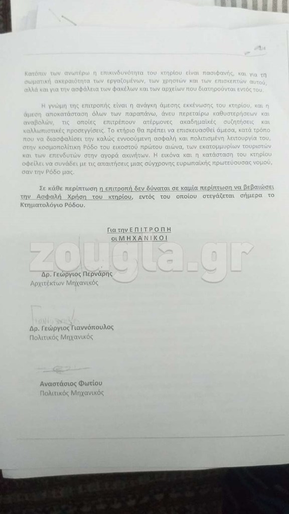 Το zougla.gr φέρνει στο φως την τελευταία έκθεση αυτοψίας. Απορίας άξιον είναι το γεγονός ότι οι προηγούμενες εκθέσεις, λίγες εβδομάδες νωρίτερα, διαπίστωναν τα ίδια περίπου προβλήματα, αλλά… έκριναν κατάλληλο για χρήση το κτήριο! Τι θα γινόταν εάν δεν αντιδρούσαν οι εργαζόμενοι;