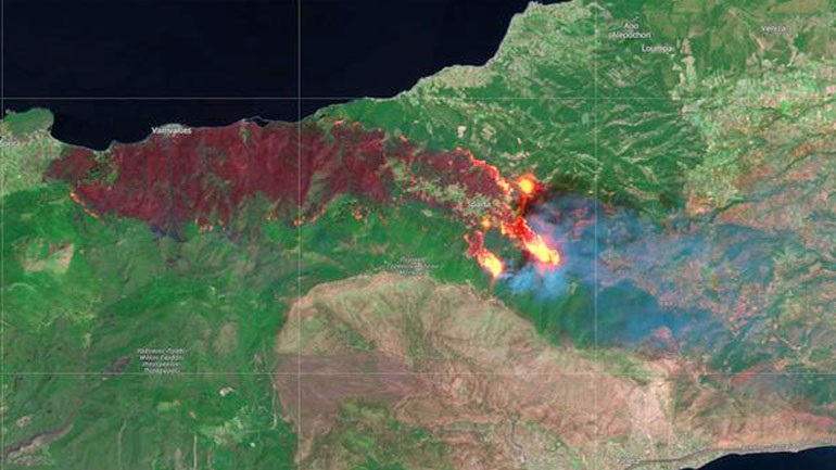 Το πρωί της Πέμπτης 20/5 ένας εκ των δύο ευρωπαϊκών δορυφόρων Sentinel-2 πέρασε πάνω από τη Δυτική Αττική και την Ανατολική Κορινθία και κατέγραψε την καμένη έκταση, καθώς και τα ενεργά μέτωπα της μεγάλης πυρκαγιάς που μαίνεται στην περιοχή από το βράδυ της Τετάρτης 19/5.