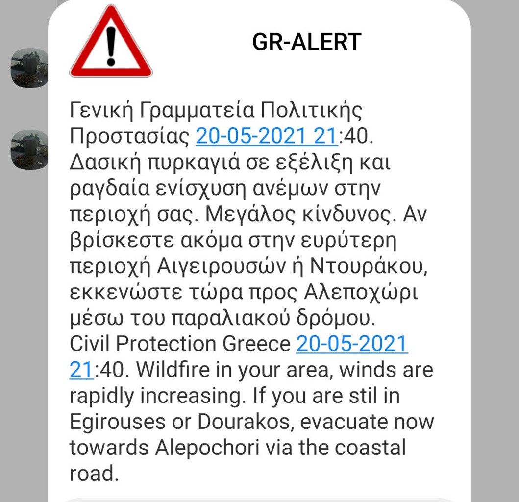Το βράδυ της Πέμπτης η Γενική Γραμματεία Πολιτικής Προστασίας έστειλε νέο μήνυμα από τον Ευρωπαϊκό Αριθμό Έκτακτης Ανάγκης 112, με το οποίο συστήνει στους κατοίκους αλλά και όσους βρίσκονται στην ευρύτερη περιοχή μεταξύ Λιακωτού, Κάτω Πευκενέα, Χάνι Δερβενίου και Ιεράς Μονής Αγ. Ιερόθεου, να απομακρυνθούν άμεσα μέσω των επαρχιακών οδών προς τα Μέγαρα. Αργότερα, λίγο πριν τις 22:00, ακολούθησε ακόμα ένας συναγερμός μέσω του 112, που αναφέρει πως υπάρχει μεγάλος κίνδυνος εξαιτίας της ραγδαίας ενίσχυσης των ανέμων και προτρέπει τους κατοίκους που βρίσκονται στις περιοχές Αιγειρούσες και Ντουράκος να απομακρυνθούν προς Αλεποχώρι μέσω του παραλιακού δρόμου. Δείτε το σχετικό μήνυμα του 112: