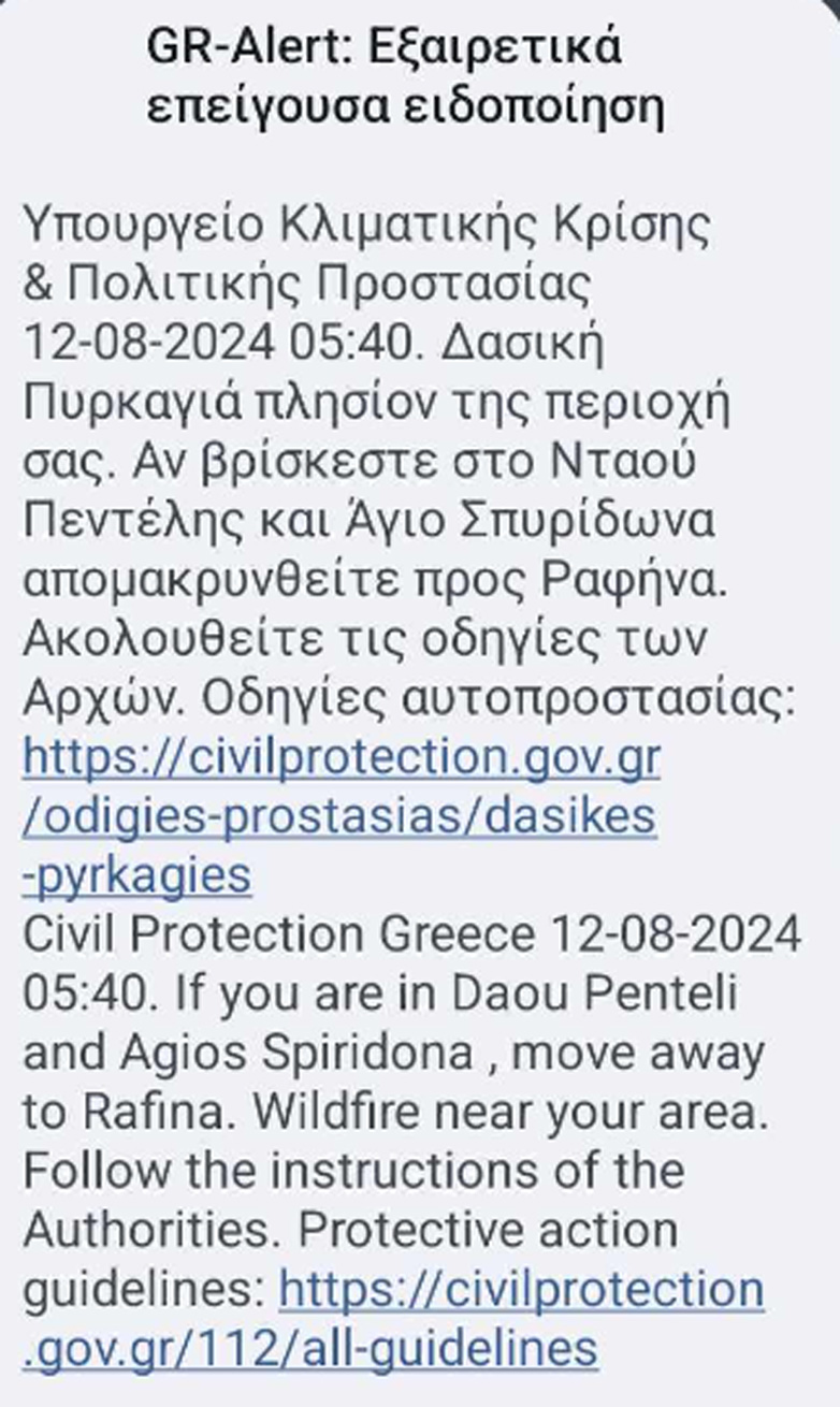 Νέο μήνυμα εστάλη από το 112, μέσω του οποίου καλούνται οι κάτοικοι των οικισμών Νταού Πεντέλης και Αγίου Σπυρίδωνα να απομακρυνθούν προς τη Ραφήνα